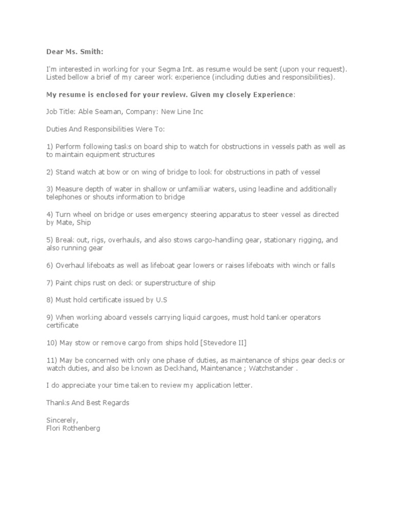 A candidate should hold a bachelor's degree in mechanical & automation engineering after attending a course of 4 years duration from an ugc recognized university and or approved by aicte, with a minimum marks of 50% in the final year; Paisley, as a highly skilled marine engineer, i read your posting for a new marine engineer with interest. The application letter is similar to that of a cover letter but takes the place of the cover letter.a cover letter's main focus is to catch the attention of the employer to land the job interview. The email subject provided on this application letter sample follows the usual format (name, position you are applying for) though some recruiters require applicants to send their application letter (and resumes. Many times, an ordinary seaman gets upgraded to an able seaman.