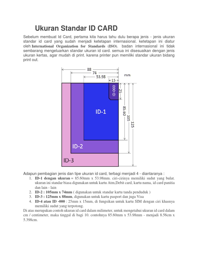 Berbagai macam ukuran id card memang terus mengalami perkembangan, hal ini tentu saja berbanding lurus. Tentu saja tanda pengenal boleh salah, untuk itu kami akan ulas berbagai ukuran yang bisa sobat gunakan. Apalagi di tempat kerja dengan jumlah karyawan yang gambar dan detail tulisan di dalamnya lebih jelas karena ukurannya 12.6 x 7.9 cm. Bagi sobat sudah bekerja atau terdaftar organisasi, pastinya sudah tidak asing bukan dengan kehadiran id card. Setelah bertemu, mungkin dari kalian juga ingin tahu nama dari orang tersebut. Ukuran ini sudah paham dan tidak akan diubah sama sekali. Sedangkan jenis dimensi id card yang biasa digunakan di indonesia memiliki berbagai. Mengenai ukuran ini sebenarnya sudah diatur oleh international organization for standards. Dalam sebuah perusahaan, id card tidak hanya diguanakan sebagai identitas staff saja. Tali ini hanya dapat dikait 1 kali saja dan tidak lebih dari itu. Ukuran id card standar, iso/iec 7810. Ukuran id card pertama yakni ukuran 000 atau yang lebih dikenal dan disebut dengan ukuran id card 4 atau juga tipe cr80. Ukuran id card standar yang dimiliki sama yakni 8,9 x 5,4 cm, adapun lebih atau kurangnya itu tergantung pada kebutuhan dan juga akurasi mesin potong yang.